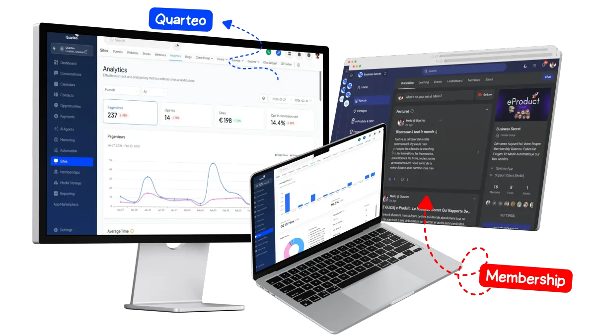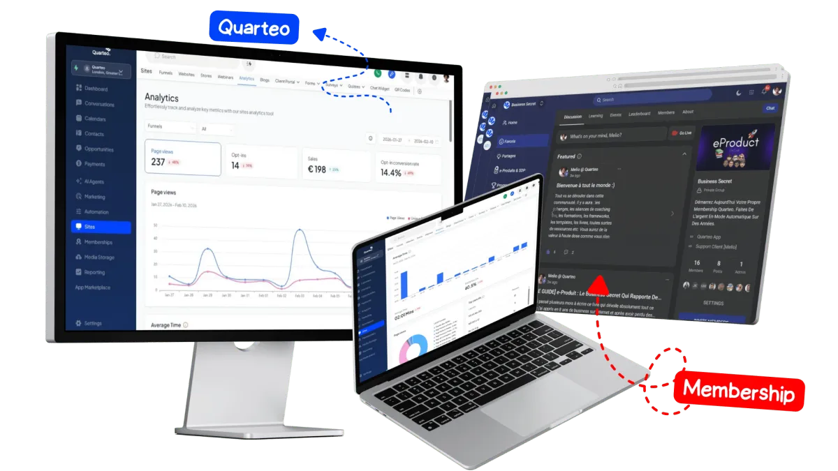 Quarteo Remplace Tout Ceci : WordPress, Wix, Squarespace, Webflow, GoDaddy, Shopify, WooCommerce, BigCommerce, Etsy, ClickFunnels, Systeme.io, Leadpages, Unbounce, Kartra, Stripe, PayPal, Square, Kajabi, Teachable, Thinkific, Podia, Udemy, Patreon, Substack, Skool, Circle, Discord, Mailchimp, ConvertKit, ActiveCampaign, Sendinblue, GetResponse, HubSpot, Salesforce, Pipedrive, Zoho CRM, Zapier, Make, IFTTT, Calendly, Acuity, Cal.com, Gumroad, Lemon Squeezy, ThriveCart, SamCart, GoHighLevel, Keap, Ontraport, Zoom, Vimeo, Wistia, WebinarJam, Dropbox, Google Drive, OneDrive, Google Analytics, Hotjar, Mixpanel, Intercom, Zendesk, Drift, Crisp & des centaines d'autres.